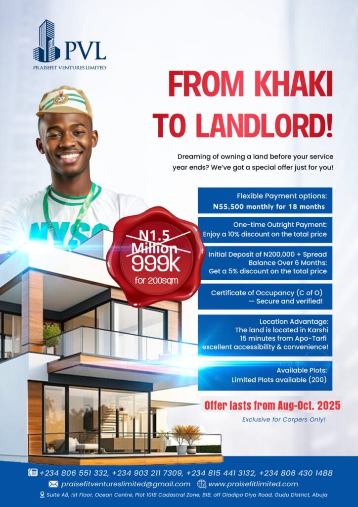 According to Naomi, the Kaki to Landlord scheme offers affordable land packages designed specifically for corps members, at ₦999,000 thousand naira. Payments can be made in instalments over a period of 18 months to two years.